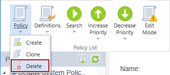 To delete a policy, first select the policy to delete , then click the Policy button and select Delete. A confirmation dialog prompts you to delete the selected policy. If an endpoint has already downloaded a policy for which you have selected Initiate Search, deleting the policy will not cancel that Search.