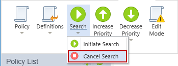 Cancel Search will not stop a search that is currently running. Cancel Search will remove any pending searches created by using the Initiate Search option. If the endpoint has already downloaded a policy that included the request to perform a search, you cannot cancel the search from the Console. Canceling a search that was initiated on a policy will also cancel a search that was initiated on an endpoint. Likewise, canceling a search that was initiated on an endpoint will also cancel a search that was initiated on a policy.