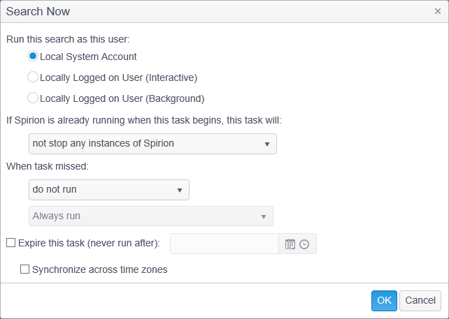 - Local System Account: Specify that the search should be run as system or root. No graphical user interface will be available to the end user and the endpoint will run silently in the background. If Run task as soon as possible after a scheduled start is missed is configured when using the Local System Account, the next time the computer is powered on, it will execute the search. Because no user credentials are available, certain locations (such as Browser Data and some E-Mail) cannot be searched.