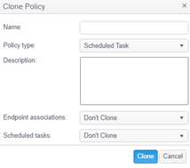 | Scheduled Tasks | This defaults to Don't Clone. Don't Clone does not include the list of scheduled tasks on the cloned policy. Clone does include all the scheduled tasks from the policy being cloned. |