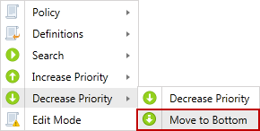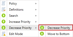 Change the priority of the selected policy to be lower than the policy below it in the Policy List. The policy at the top of the list has the highest priority and the policy at the bottom of the list has the lowest priority. For any conflicting settings in policies that apply to the same endpoint, the setting from the policy with the higher priority is used. Note: The Decrease Priority menu option is disabled when policies are sorted by name.