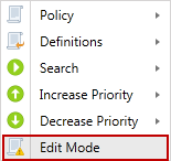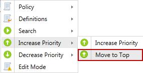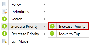 Change the priority of the selected policy to be higher than the policy above it in the Policy List. The policy at the top of the list has the highest priority and the policy at the bottom of the list has the lowest priority. For any conflicting settings in policies that apply to the same endpoint, the setting from the policy with the higher priority is used. Note: The Increase Priority menu option is disabled when policies are sorted by name.
