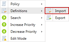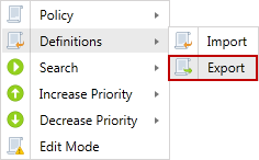 Export or import a policy definition in xml format. The policy definition contains the settings and search locations of the selected policy. The policy definitions can be exported as xml definitions files to be imported into another Console server. The most common scenario for exporting and importing policy definitions are to move policies from staging/test Consoles into production.