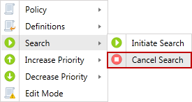 Cancel Search does not stop a search that is currently running. Cancel Search removes any pending searches created by using the Initiate Search option. If the endpoint has already downloaded a policy that included the request to perform a search, you cannot cancel the search from the Console. The Cancel Search menu item is enabled for System and Scheduled Task type policies only.