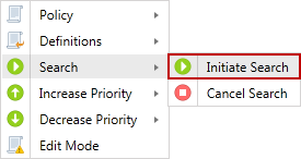 You can directly initiate a search on all tags and endpoints to which the selected policy has been applied via the Search menu item. The Initiate Search menu item is enabled for System and Scheduled Task type policies only. If selecting Initiate Search from a System policy, the search uses the settings defined in that System policy and any other System Policies to which the endpoints in the selected policy belong. If selecting Initiate Search from a Scheduled Task policy, the search uses any settings defined in the selected Scheduled Task policy and all settings defined any System Policy to which the endpoints in the selected policy belong.