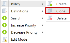 The policy type cannot be changed after it is created, but the Clone function can be used to assist with that task if necessary. The cloned policy includes the Settings and Search Locations of the original policy. To clone a policy, you must first highlight the policy name or the clone option is dimmed.