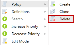 Permanently delete the selected policy. To delete a policy, you must first highlight the policy name or the delete option is dimmed. A confirmation dialog prompts you to ensure that you would like to delete the selected policy. Policy deletion is a permanent operation and cannot be undone. If an endpoint has already downloaded a policy for which you have selected Initiate Search, deleting the policy will not cancel that Search.