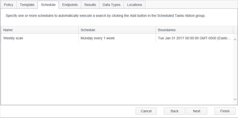 The Schedule tab allows you to specify one or more schedules to automatically execute a search on the endpoints to which the policy is applied. This tab only displays when creating a Scheduled Task policy.