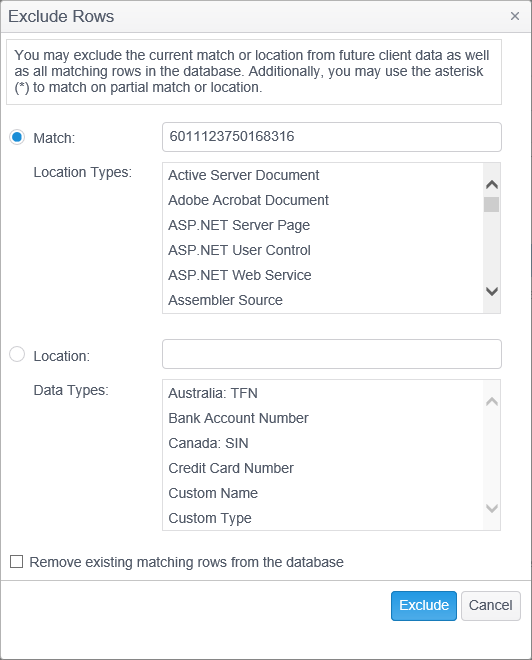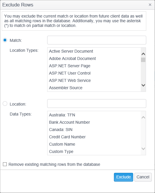 - Data Types: Select which data types to exclude for the location entered above. Only the selected data types will be excluded when found in the location that you entered. If you do not select any data types, it is the same as selecting all data types.
