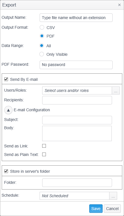 Enable this option to send the saved file via email. Either this option or Store in server's folder must be selected if the export is to be scheduled. In order to email an export, you first need to configure SMTP settings in the CAT.