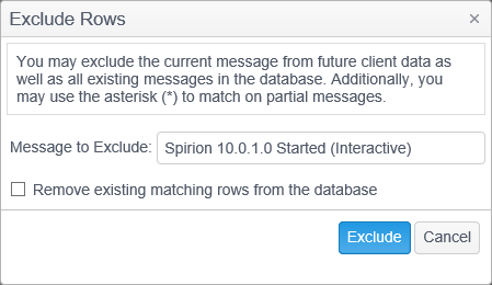 The Exclude Rows button prevents the selected type of message from being imported into the Console. It also provides the option of preventing any existing messages of the selected type, currently in the database, from displaying in the logs view. Additionally, you have the option to match on partial messages by placing an asterisk before or after the text in the "Message to Exclude" field. The Agents continue to provide this information but the Console ignores it when storing information in the database.