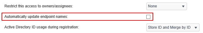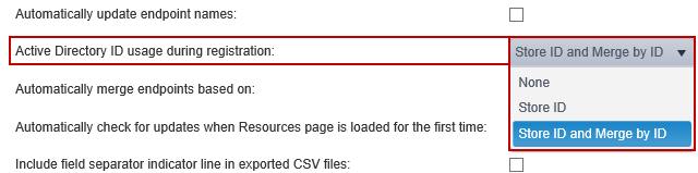 - Store ID and Merge by ID: Stores Active Directory ID during endpoint registration with the endpoint in db and additionally attempts to merge the endpoint with the known endpoint. If successful, other merge modes are ignored, even if enabled. If unsuccessful, other merge modes are taken into account. This is the default setting.