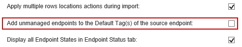 When this setting is enabled and an unmanaged endpoint has been searched remotely from another endpoint (the Source endpoint) that is in the Default Tag, the unmanaged endpoint is added to that same Default Tag as long as the unmanaged endpoint is not part of any other tag (excluding the All Endpoints tag). If the unmanaged endpoint already belongs to any other tag, then it is not added to the Default Tag. When this setting is disabled, which is the default setting, and the unmanaged endpoint is searched remotely, the unmanaged endpoint is not added to that Default tag.