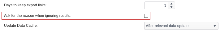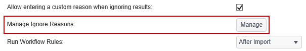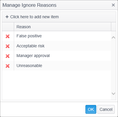 When this setting is enabled and a Console user ignores a result, they are presented with a list of pre-defined reasons as to why the result is being ignored. Reasons are defined in the Manage Ignore Reasons setting.