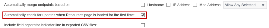 When this setting is enabled and you open the Resources page on the Admin tab, the Console automatically checks for updates to the following:
