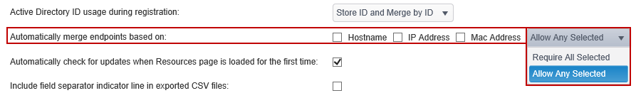 - Require All Selected: The Console uses a logical AND operation when evaluating if endpoints should be merged, meaning only when all of the selected criteria are met the endpoints are merged.