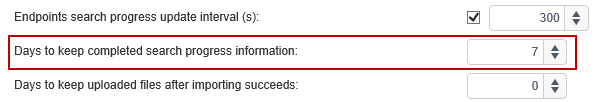 By default, search progress information for completed searches is kept for 7 days. Valid values are 0-9,999. A value of 0 means the search progress information of a completed search is deleted the next time the Importing service job executes.