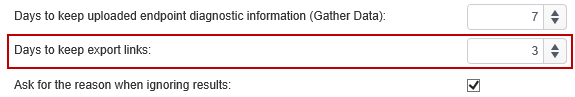 This setting is the number of days until an exported link is marked for deletion. Exported links are created when you export results, reports or logs to an email recipient using the 'Send as Link' option. When the link is created, the value in the "Days to keep export link" field determines the number of days until the link is marked for deletion. So even though the link may have expired, you can still access it because it has not actually been deleted. The process of deleting a link happens the next time an export, either manual or scheduled, has been run after a link has expired.