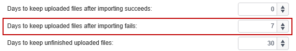 The default value is 7 which causes uploaded files to be deleted 7 days after a failed import.