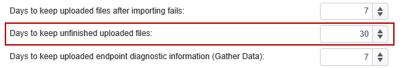 The default value is 30 which causes unfinished uploaded files to be deleted after 30 days. Valid values are 1-9999.