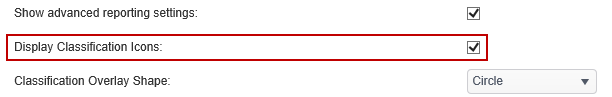 When this setting is enabled, any classification icons that you have loaded are displayed when assigning or viewing classifications, or viewing the workflow rules list. When no icon is present, the selected overlay shape displays with the appropriate classification color. Disabling this setting uses the selected overlay shape as specified in the Classification Overlay Shape setting.