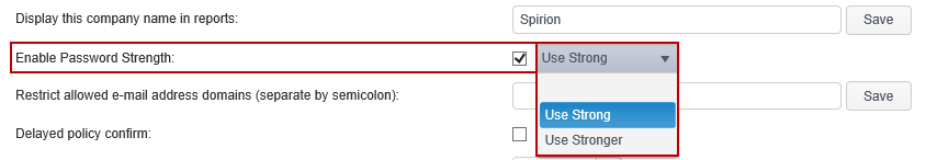 The Enable Password Strength setting forces all passwords entered within the Spirion application to adhere to the selected setting. When disabled, passwords can be any length and contain any characters.