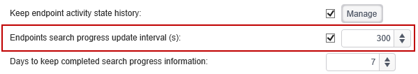 When this settings is enabled, endpoints send search progress updates to the Console. The value entered is the time, in seconds, between each update. The search progress for an endpoint can be viewed on the Searches in Progress tab on the Endpoint Status Detail page. The minimum value is 60. If you enter a value less than 60 it automatically changes to 60 upon clicking elsewhere on the page or selecting another page. This setting is enabled by default and the default value is 300.