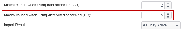 When using Discovery Teams to search a target, this is the maximum amount of data, in gigabytes, that a team member searches. The amount of data from all targets is calculated and split into data sets, with no data set exceeding the value in the maximum load unless a single folder exceeds the value in the maximum load, that folder is not divided and is searched by a single team member. Valid values are 1-999,999. The default value is 5.