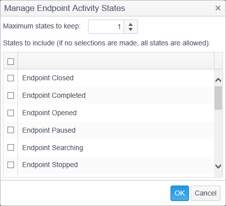 Click the Manage button and the Mange Endpoint Activity States dialog opens, displaying maximum states to keep and the states to include.