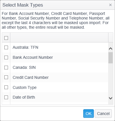 Once enabled, use the Manage button to display the Select Match Types dialog and select the specific match types to be masked during import