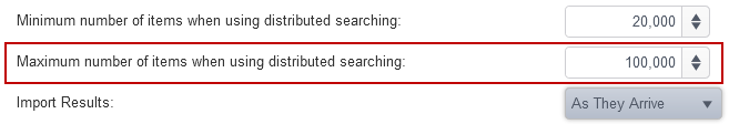 When using the maximum number of items while using distributed searching, this is the maximum amount of items that can be assigned. Valid values are 0-999,999,999. The default value is 100,000.