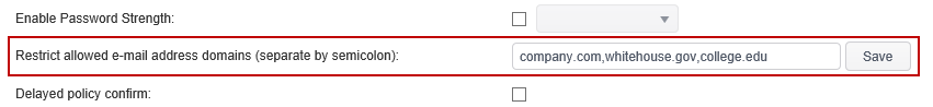 This setting gives the ability to restrict the email address users are able to enter to only the specified domains. Enter each domain you wish to allow, separated by a semicolon. If a user attempts to enter an email address using a domain that is not designated here, a warning message displays that the domain is not allowed. If this field is left blank, users are allowed to enter any domain they wish.