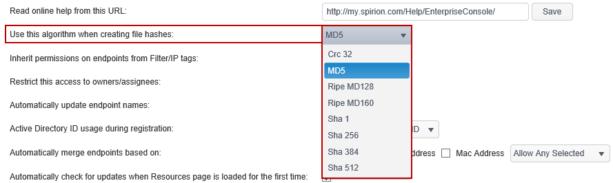 When using file hashes for Global Ignore Lists or adding file hashes to search locations in a policy, it is possible to specify the algorithm to be used for the hashing. Changing this setting after hashes have been created invalidates any existing hashes. The Console and all endpoints must be configured, in unison, to use the same file hashing algorithm. The hash algorithm can be specified for endpoints with the following policy setting: