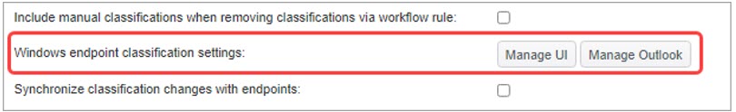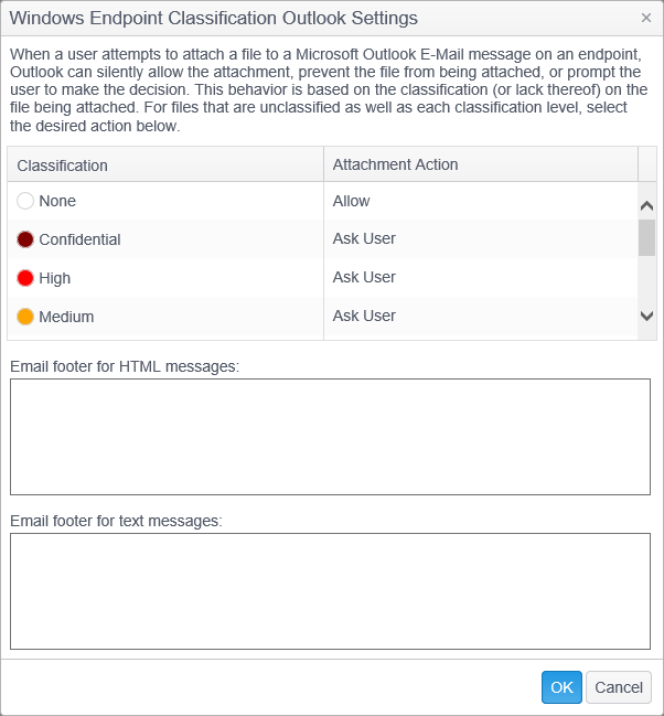 Click the Manage Outlook button and the Windows Endpoint Classification Outlook Settings dialog opens. These settings allow you to specify the action when a user attempts to attach a file to a Microsoft Outlook email message on an endpoint. The action is based on the classification, or lack thereof, of the file being attached.