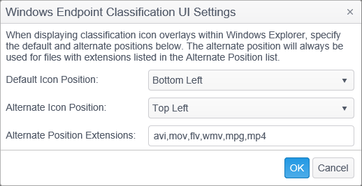- Alternate Position Extensions: Specify which file extensions will use the Alternate Icon Position setting by entering each extension separated by a comma. The default value is avi,mov,flv,wmv,mpg,mp4.