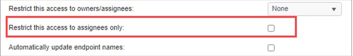 - Views and Actions: In addition to the above, this setting also filters the results to display only those items where the logged in user is the owner or an assignee by name or role. Reports that include match or match location information only display rows where the logged in user is the owner or an assignee by name or role.