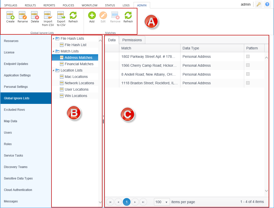 - The Global Ignore Lists: Displays and allows creation, editing and management of entries within the selected Global Ignore List.