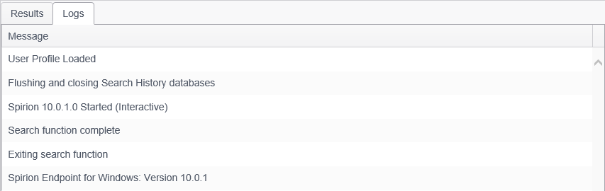 Console allows you to define data to never display (exclude from viewing) in the Console. The data to never display in the Console is still reported by the Agent software, but the Console does not save the data into its database, reducing database space and improving performance. This allows end users of the Agent software to still see these results in their user interface, without having that information stored in the Console database. The excluded rows content consists of a Results tab and a Logs tab. You may sort the columns in both the Results tab and Logs tab by clicking on a specific column header to toggle between ascending, descending and no sort. Any column which has sorting on it displays an up arrow or a down arrow in the center of the column header indicating ascending or descending, respectively. No arrow indicates that column is not sorted. When you click on a column header to set a sort it removes any previous sorting from all other columns. You can reorder the columns by clicking on the column header and dragging and dropping them to the left or right.