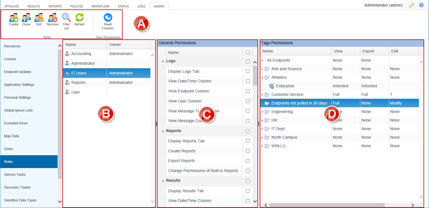 - The Tags Permissions group: Where you grant or exclude permissions to users to view and export results data.