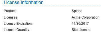 The license information section displays details about your Spirion license, such as who it is registered to, when it expires, and to which modules you have access.