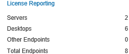 The license reporting section displays information on the number and type of endpoints which are reporting to the Console.