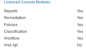 | Remediation | Indicates whether or not you are licensed to remediate findings remotely from the Console. |