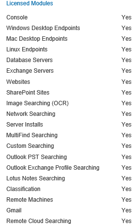 | Exchange Servers | Indicates whether or not you are licensed to search email messages and attachments on Exchange mail servers. |