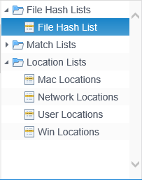 The Global Ignore Lists displays the File Hash Lists folder, the Match Lists folder, and the Location Lists folder. Clicking on one of the folders or on the arrow to the left of the folder expands that folder and display the lists within the folder. Clicking one of the lists displays each entry within that list allowing you to add a new entry. Once added to a policy, any items in the list are ignored during searches on the endpoints to which the policy applies.