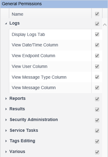 Field Description Manage All Service Tasks Displays the Service Tasks page and grants the ability to view all service tasks created by any user. To manage an existing service task or create a new service task, you must also have the specific corresponding service task permission. Manage Own Service Tasks Displays the Service Tasks page and grants the ability to view only those service tasks created by the logged in user. To create a new service task, you must also have the specific corresponding service task permission. Manage Data Clean Up Grants the ability to manage the Data Clean Up service task. Manage Database Maintenance Grants the ability to manage the Database Maintenance service task. Manage Endpoints Merging Grants the ability to manage the Endpoints Merging service task. Manage Importing Grants the ability to manage the Importing service task. Manage Prune Endpoints Grants the ability to manage the Prune Endpoints service task. Manage Purge Endpoint Activity Grants the ability to manage the Purge Endpoint Activity service task. Manage Purge Logs Grants the ability to manage the Purge Logs service task. Manage Purge Match Previews Grants the ability to manage the Purge Match Previews service task. Manage Purge Matches Grants the ability to manage the Purge Matches service task. Manage Purge Messages Grants the ability to manage the Purge Messages service task. Manage Purge Results Grants the ability to manage the Purge Results service task. Manage Replication Grants the ability to manage the Replication service task. Manage Run Workflow Rules Grants the ability to manage the Run Workflow Rules service task. Manage Synchronize AD Users Grants the ability to manage the Synchronize AD Users service task. Manage Synchronize Tags Grants the ability to manage the Synchronize tags service task. Manage Trace Log Cleanup Grants the ability to manage the Trace Log Cleanup service task. Manage Tune Reports Grants the ability to manage the Tune Reports service task. Manage Update Data Cache Grants the ability to manage the Update Data Cache service task. Manage Update Policy States Grants the ability to manage the Update Policy States service task. -