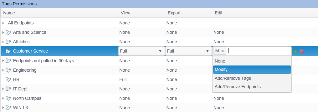 Displays the edit permissions that have been granted to the role for creating and maintaining tags for the selected tag and for the endpoints within that tag. To modify these permissions click in the Edit column of the tag that you wish to modify and then click on the drop-down box. Select the permissions that you wish to enable by single left clicking the mouse on the permission. The selected permission is highlighted in blue when enabled. Click the Green checkmark to save your selections. To remove a permission click the permission again to deselect it and click the green checkmark.. The view permission must be enabled in order to change these permissions. If you remove the view permission the Edit permissions are also removed. The following edit permissions are available.