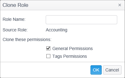 Enter a name for the new role and select whether you want to clone the General Permissions and the Tags Permissions by placing a check mark in the respective boxes and click OK.