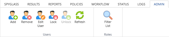 - Users: Allows adding, editing, removing, and searching of users and refreshing the list of users to reflect any changes since the last logon or refresh.
