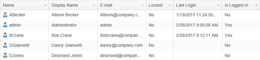 You may sort the users by clicking on the User Name, Display Name, Email, Locked, Last Login or Is Logged In column header to toggle between ascending, descending and no sort. When the column has sorting on it displays an up arrow or a down arrow in the center of the column header indicating ascending or descending, respectively. No arrow indicates that column is not sorted.
