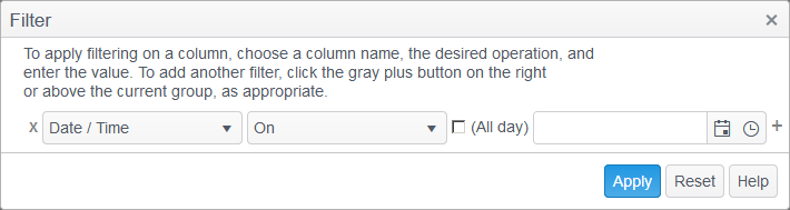 - Date / Time - If the (All day) option is selected, the time portion of the filter does not display. If the (All day) option is not selected, the time portion of the filter displays and is applied.
